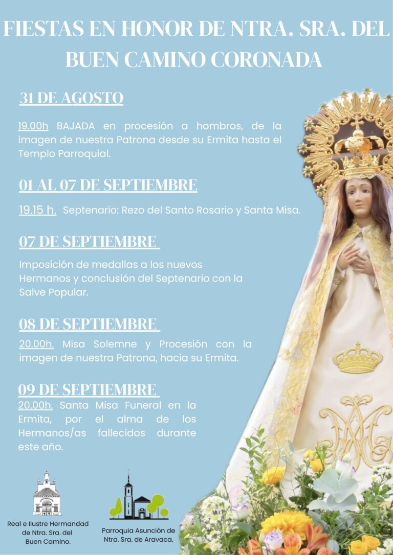 El pasado 31 de agosto comenzaron las celebraciones con la Bajada de la Virgen desde su Ermita hasta el templo parroquial, portada a hombros de los Hermanos. Un momento siempre especial que marca el inicio de unos d铆as llenos de fe, emoci贸n y tradici贸n.