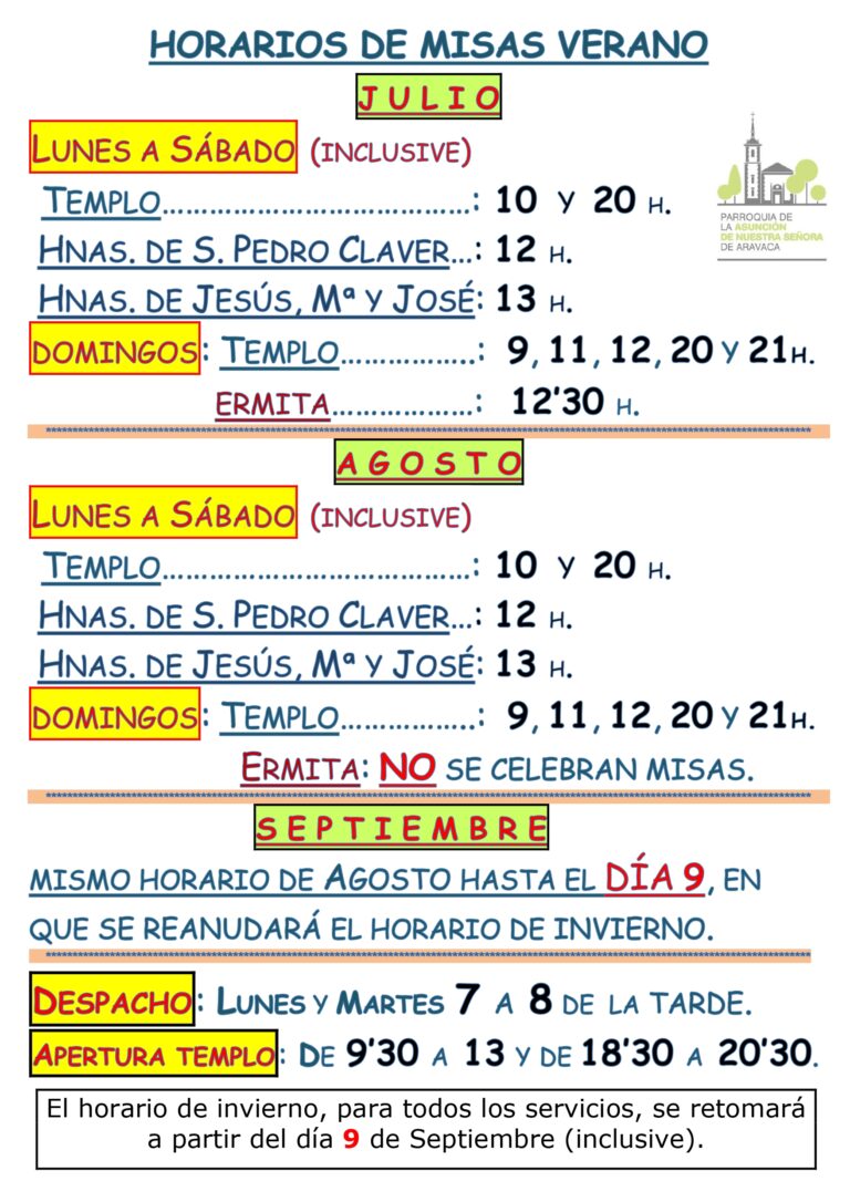 Durante los meses de julio y agosto, los horarios de misas en nuestra parroquia se adaptan al ritmo del verano. A continuación, te dejamos todos los detalles para que puedas seguir participando en la Eucaristía durante este tiempo: