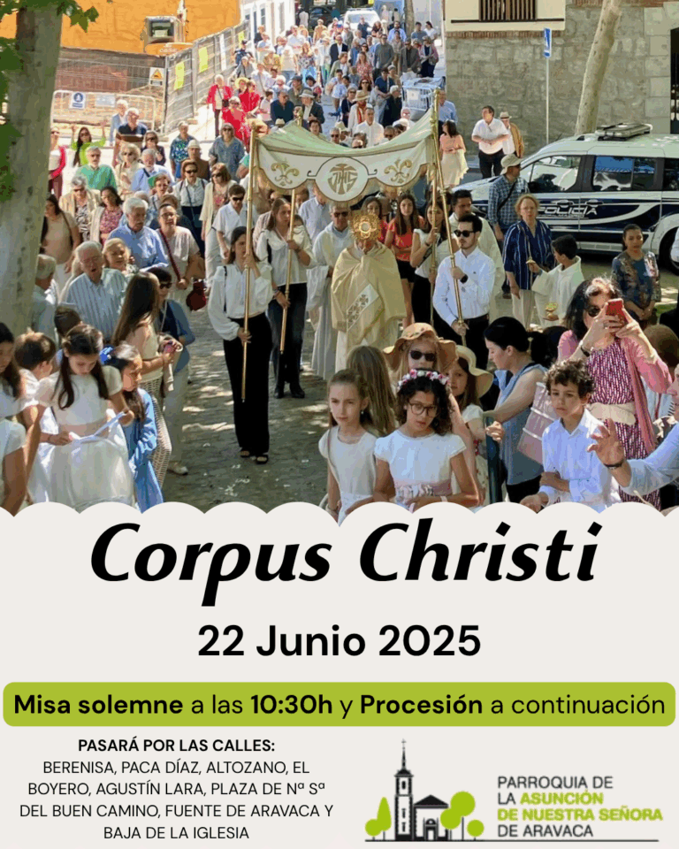 Este domingo 22 de junio, la Parroquia de la Asunción de Nuestra Señora de Aravaca celebra con alegría la Solemnidad del Corpus Christi, una de las fiestas más importantes del calendario litúrgico, en la que manifestamos públicamente nuestra fe en la presencia real de Jesús en la Eucaristía.